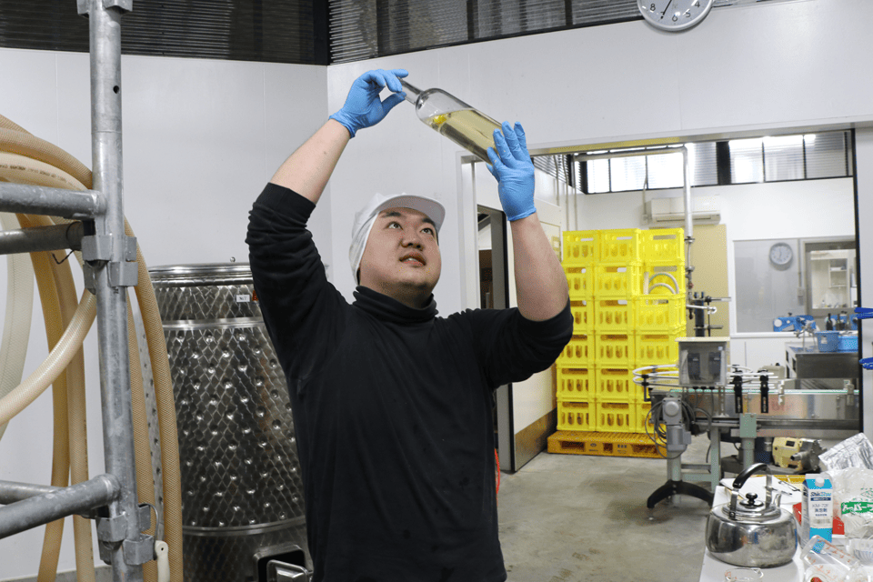 移送が終わると、すぐに行われるのが瓶を使った品質チェック。少量を取り分け、光に透かして色合いと透明度を確認し、さらに香りを確かめ、口に含んで味わいの輪郭を探ります。フルーティーなアロマが立ち上がるか、酸味と甘みのバランスは整っているか──その一つひとつが、最終的なリリース判断につながります。