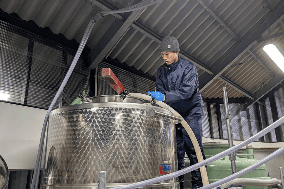 2月発売予定の「ナイアガラ フリーラン・ブラン」は、いよいよ最終仕上げの段階に入りました。今回行われているのは、ワインの透明感を整えるための濾過作業と、仕上がった液体を別タンクへ移送する工程。ホースを通じて静かに流れていくワインの一滴一滴に、スタッフの視線が注がれます。