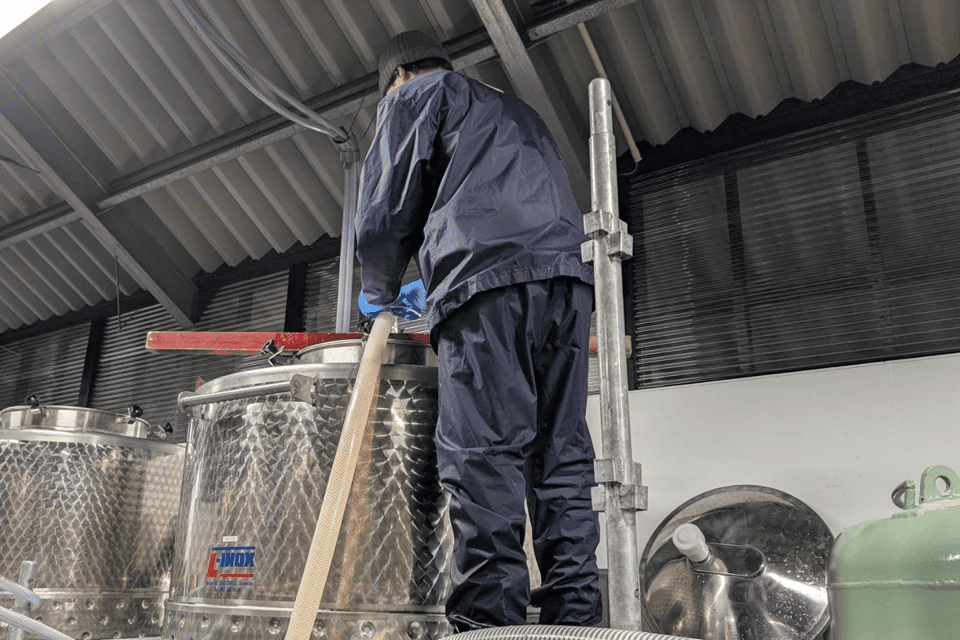 今回の現場では、澄んだ味わいを実現するための濾過作業が行われ、その後ワインは次の熟成・調整段階へ向けて別タンクへと移されていきます。