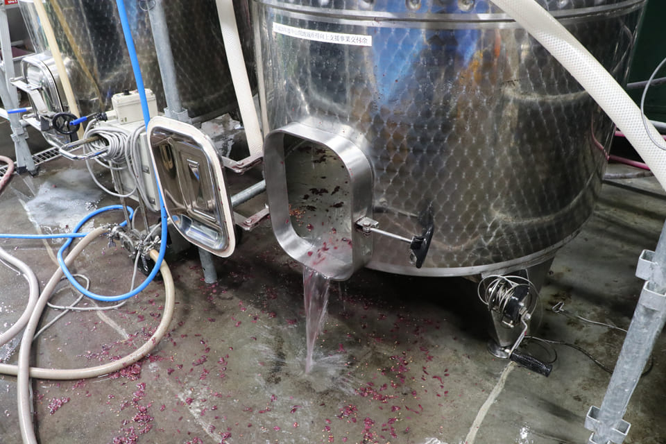 小坂七滝ワイナリーでは、発酵を終えた醪(もろみ)をタンクから取り出し、圧搾工程へと移ります。タンクの底には果皮・種子・果肉が沈殿し、発酵によって生成されたアルコールや色素、タンニンが抽出されています。この段階では液体と固形物が混ざり合っており、まずは重力で自然に流れ出る「フリーランワイン」を回収します。これは雑味が少なく、香りが華やかでエレガントな特性を持ち、最終的なワインの「芯」となる部分です。
