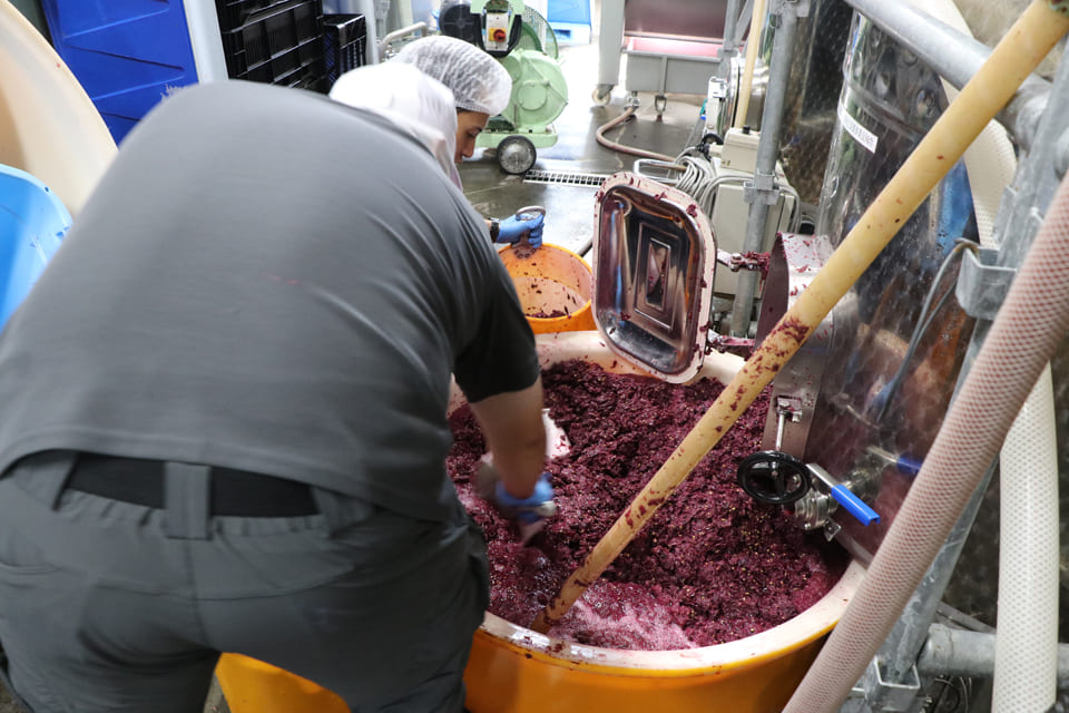 そしていよいよ、収穫されたぶどうが最初に向かうのが「除梗・破砕」の工程です。収穫した房から果梗(かこう:粒がつく軸の部分)を取り除き、果粒だけに分けます。専用の機械のドラムが回転することで、粒は下に落ち、軸は分別される仕組みです。その後、粒はやさしく破砕され、果汁をタンクに送る準備が整います。果梗を取り除くことで雑味を防ぎ、ぶどう本来のフレッシュな香りと味わいを引き出すことができます。