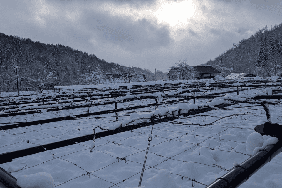 雪の下ではぶどうの樹が力を蓄え、春の芽吹きを待っています。そして畑を守る職人たちは、寒さの中でも棚の状態を確認し、雪の重みが枝に負担をかけていないかを見回りながら、次の季節への備えを怠りません。