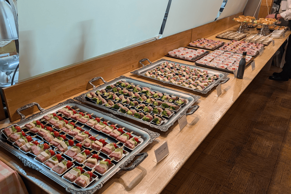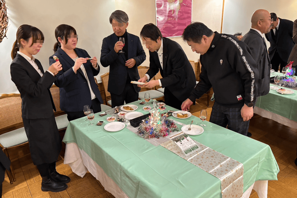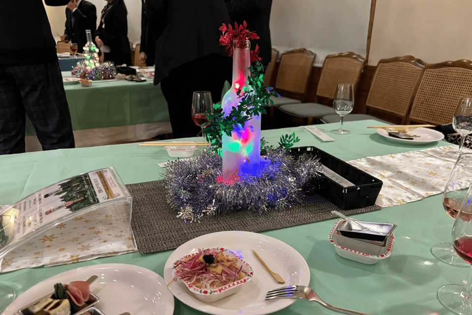 会場では、まずグラスへ注がれるヌーヴォーの色合いや香りを確かめながら、スタッフによるワイン解説を交え、今年の醸造について理解を深めていただきました。その後は、地元食材を活かした料理とのペアリングがスタート。テーブルにはクリスマスをイメージしたデコレーションが施され、彩り豊かな料理が並び会場を華やかに彩りました。
