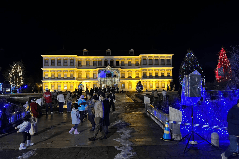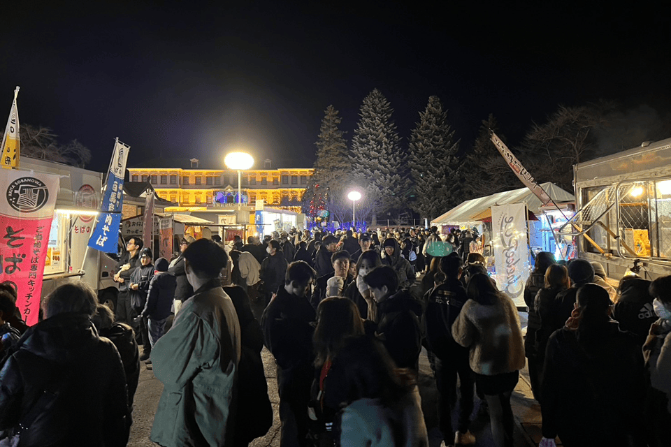 会場となったエリア一帯は、ライトアップされた歴史的建築とイルミネーションが幻想的な空間を演出し、家族連れや若者、観光客が行き交う姿が印象的でした。飲食ブースやキッチンカーが立ち並び、冬の夜ならではの温かな料理や飲み物を楽しむ光景が広がりました。