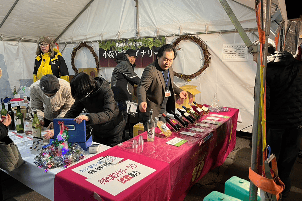 その中で、小坂七滝ワイナリーは今年も存在感のある出店を行いました。ワインの試飲・販売を通じて、地元産ぶどうから生まれるワインの魅力を来場者に直接伝え、町の食文化を支える役割を果たしました。特に寒さの中で味わうワインは好評で、多くの来場者が足を止め、スタッフとの会話を楽しむ様子が見られました。