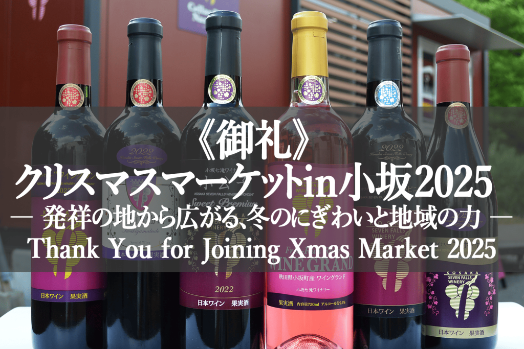 12月20日・21日の2日間、小坂町で恒例の「クリスマスマーケット」が開催されました。近年では各地で見られるようになったこのイベントですが、その発祥は小坂町にあると言われています。今年も多くの来場者でにぎわい、小坂七滝ワイナリーをはじめとする地元事業者の活躍が、イベントを力強く支えました。